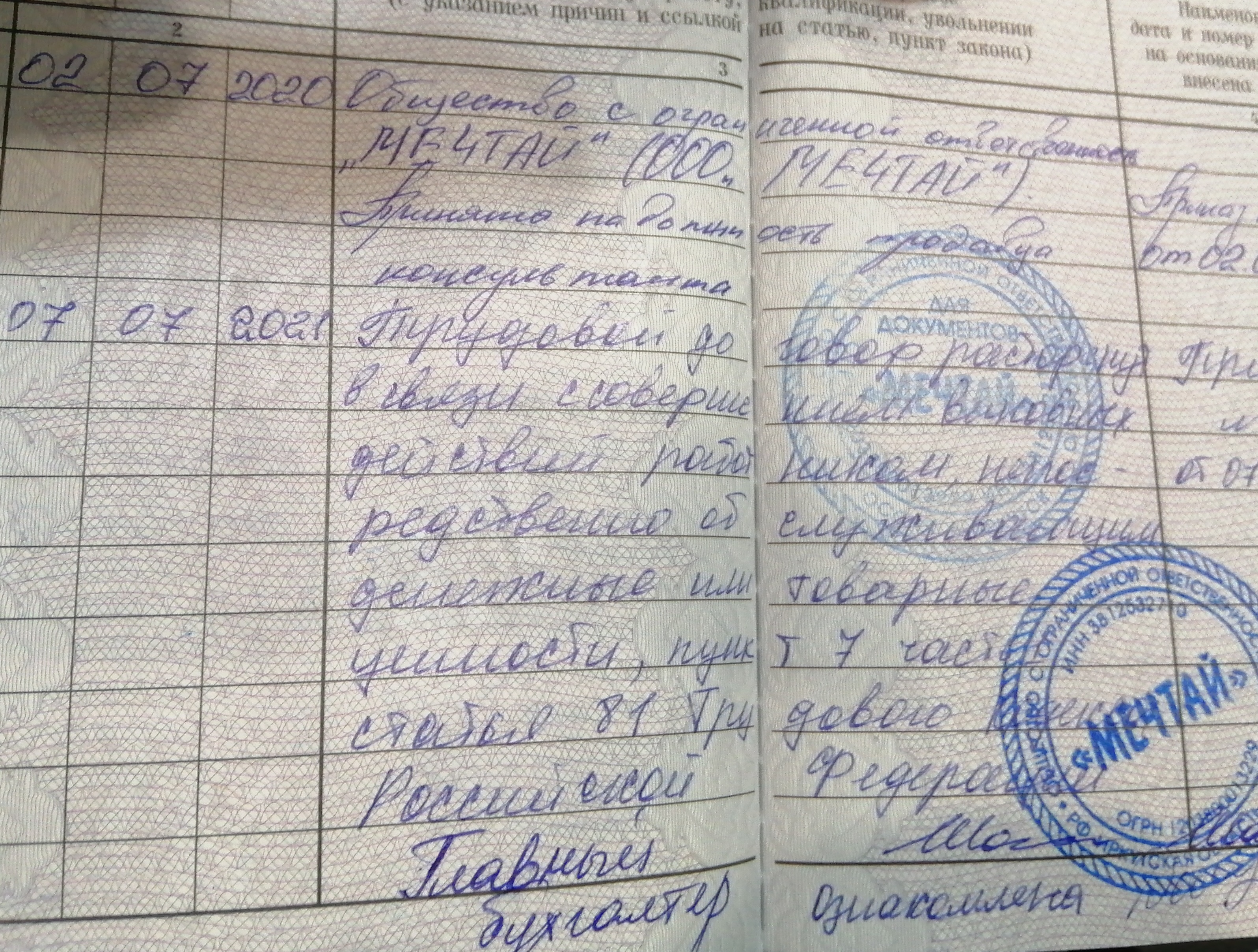Наталья была готова стерпеть увольнение, запугивание и утрату 61362 руб., которые она была вынуждена взять в кредит, а также допросы в полиции. Единственное, что просила Наталья, — это не вносить в трудовую книжку статью, так как СЦ “Молоток”— не последнее место, где она собиралась работать.